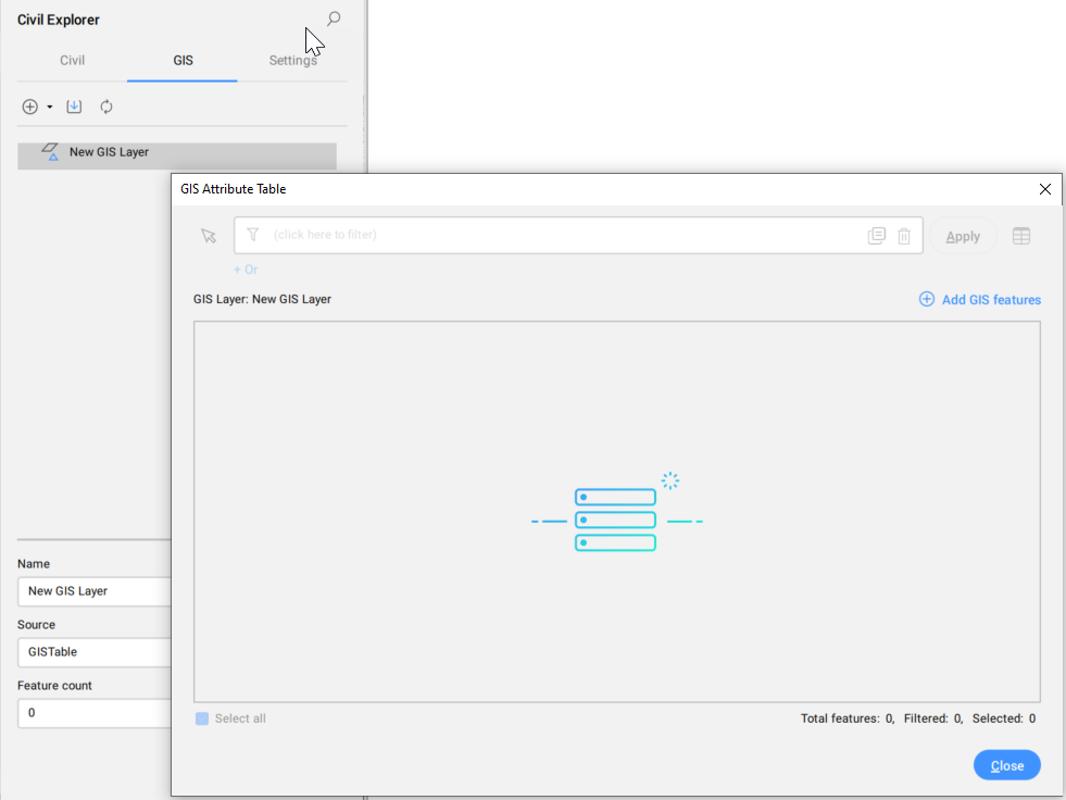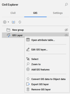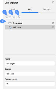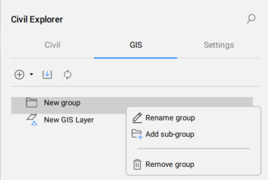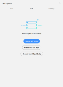 Civil Explorer 面板包含三个标签页:土木地理信息系统(GIS)和设置(Settings)。