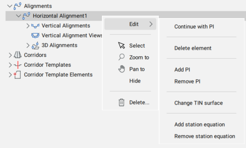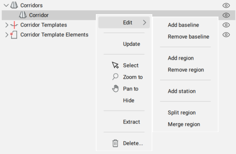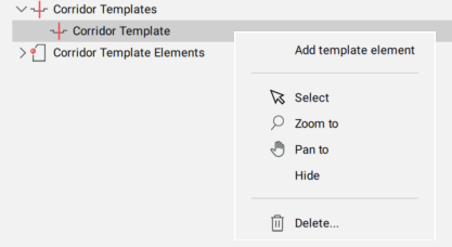右键点击走廊模板元素即可获得CORRIDORTEMPLATEELEMENT命令中所有可用的编辑选项。除了编辑选项外,还有常见选项,如选择、缩放、平移、隐藏和删除。