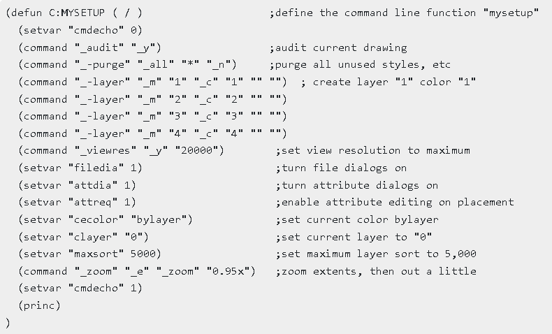 如果你不包含 defun,程序只会运行一次,当你按文件名加载时。使用defun并在你的LSP中加载这个例程,只要输入函数名mysetup,函数随时可用。