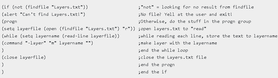 以下示例可以添加到你的mysetup.lsp版本中。通过使用像Notepad这样的编辑器创建一个简单的文本文件“Layers.txt”,你可以添加一个在例程运行时需要创建的图层名称列表。这是上述硬编码过程的替代方案。通过查找文件功能,THCAD 会先搜索当前目录,然后依次在你定义的支持文件夹中搜索Layers.txt文件。你可以把默认图层设置的文本文件放在支持路径里,然后把它的替代版本放在各个项目文件夹里。