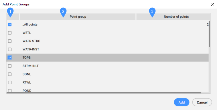 注意:默认情况下,土木积分被归入“_All积分组”。使用CIVILPOINTGROUP命令创建新的点组。