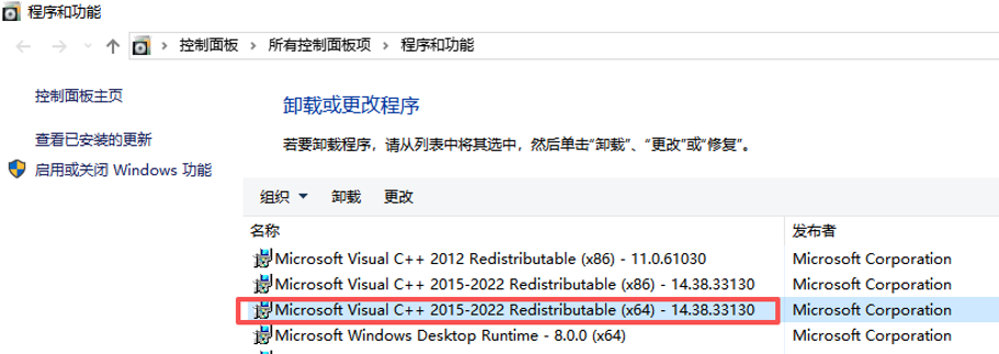 1、在程序和功能中找到 Microsoft Visual C++ 2015-2022 Redistributable (x64) ,卸载;