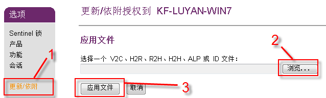 点“更新/依附”,然后点“浏览…”按钮,选择收到的V2C文件,再点“应用文件”按钮即可。
