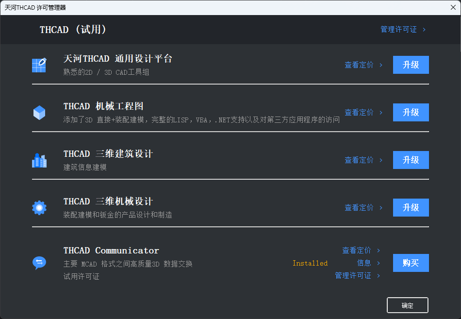 LicenseManager命令会弹出一个THCAD的许可证对话框。