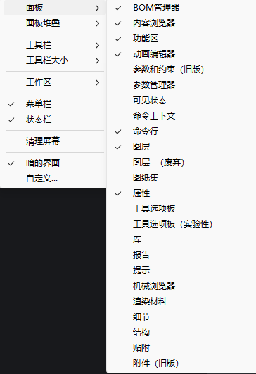 可用的面板包括:动画编辑器,附件,BIM BCF,BIM合成,BIM配置文件,BIM项目浏览器,BOM管理器,命令行,内容浏览器,详细信息,图形自定义,图层,库,机械浏览器,参数和约束,属性,渲染材料,报告,功能区,图纸集,结构,技巧,工具选项板