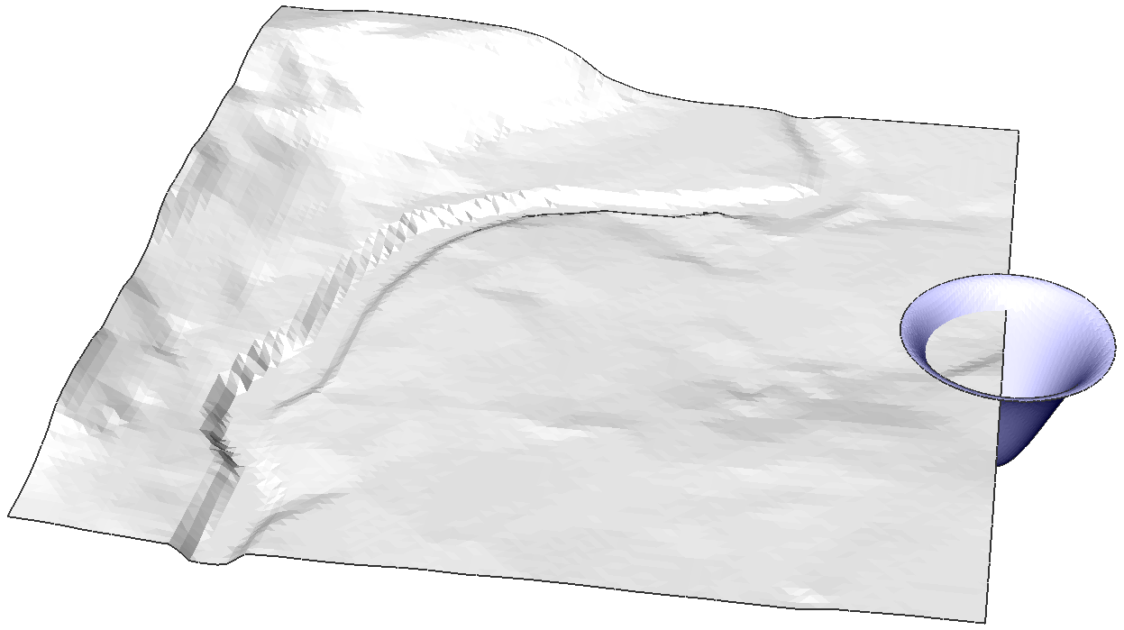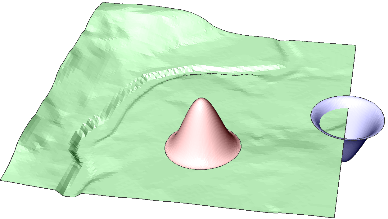 可以通过变形或平滑化曲面来修改TIN曲面。通过使曲面变形,可根据用户定义的区域轮廓调整TIN曲面。通过平滑曲面,通过对该预定义区域进行插值来平整选定区域。