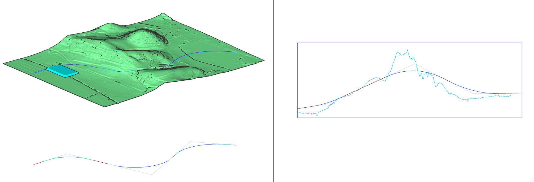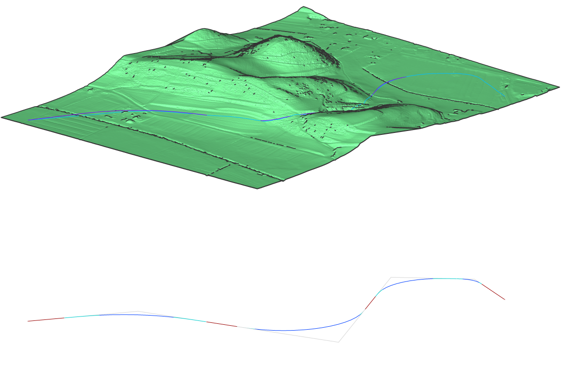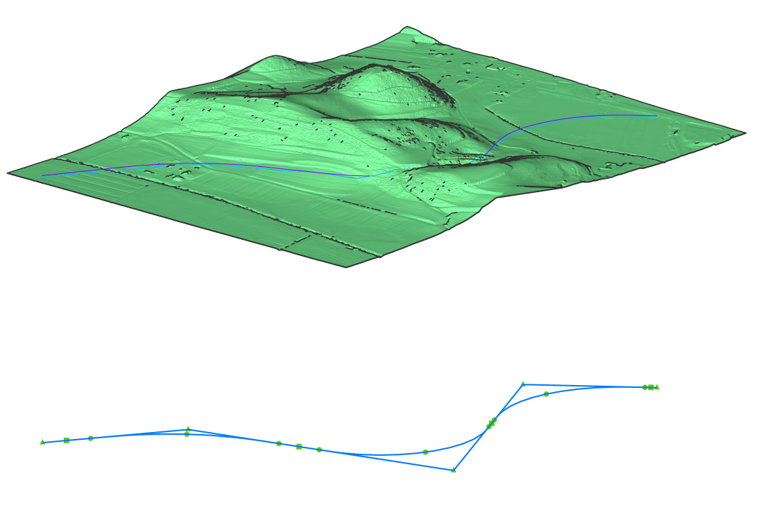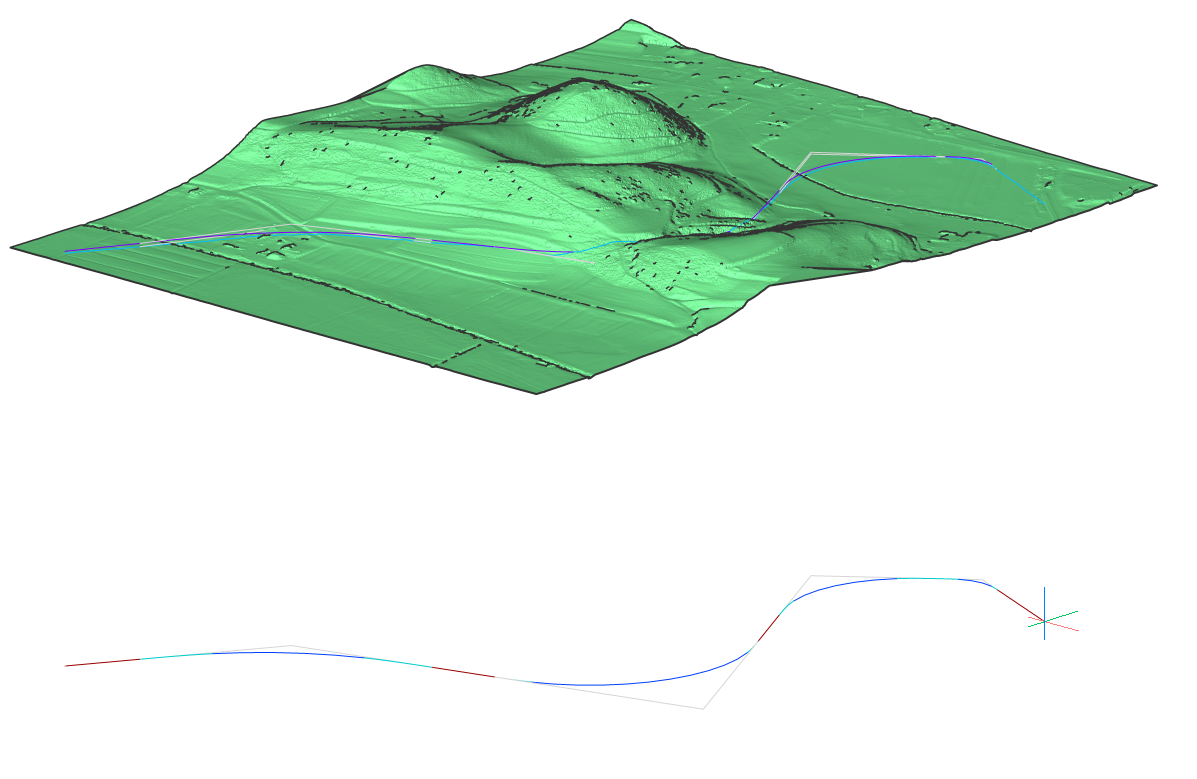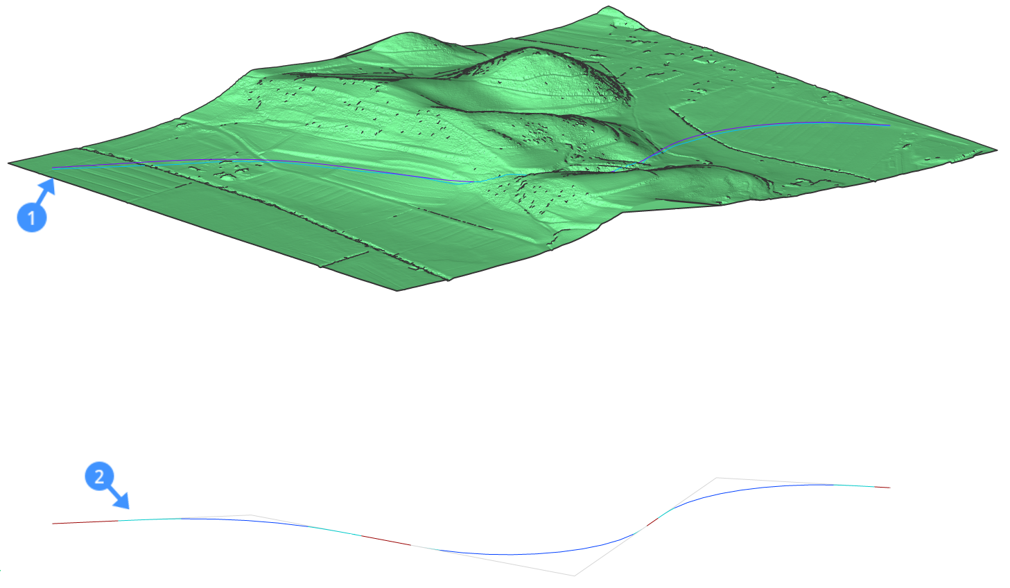 需要垂直对齐以在垂直方向上精确定义线性对象。由水平对齐方式定义的水平路径与TIN曲面的垂直轮廓相对应。通过在目标表面的这些垂直轮廓上定义垂直交叉点(PVI),新的2D曲线定义了垂直对齐方式。