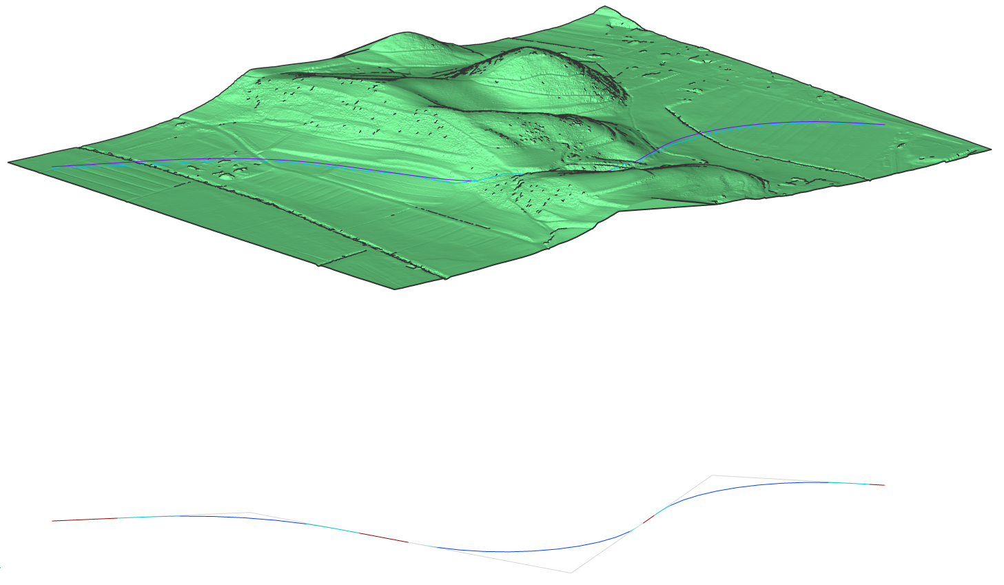 注意:显示了三个路线。平面0,0上的水平对齐方式,浅蓝色3D对齐方式显示水平对齐方式在TIN表面上的投影,紫色3D对齐方式显示自动生成的设计对齐方式。