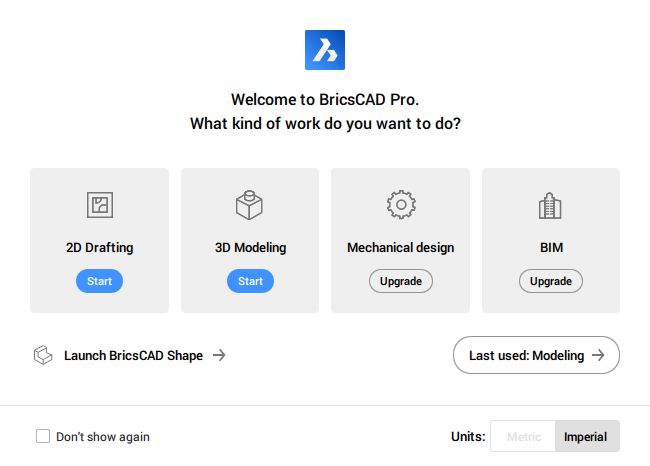 如果GETSTARTED变量为ON,则启动BricsCAD时将显示BricsCAD启动器对话框。在这里,您可以选择当前会话的工作区。可用的工作区取决于许可证级别。