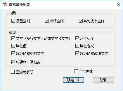 4. 选择“选项”指定要包含在搜索中的文字范围、类型及标题栏、明细表数据等,如图5-13所示。同时可以指定全字匹配,也可以指定区分大小写。