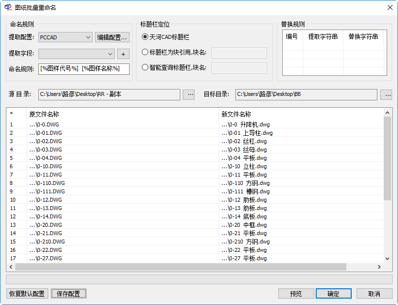 保存配置:对本次设置的标题栏定位、命名规则和替换规则进行保存。