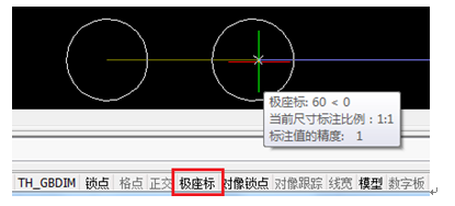 这时只要单击选择窗口下方状态栏中的“极坐标”按钮,使其关闭(即灰显)后,就可选中第二个圆的圆心了。