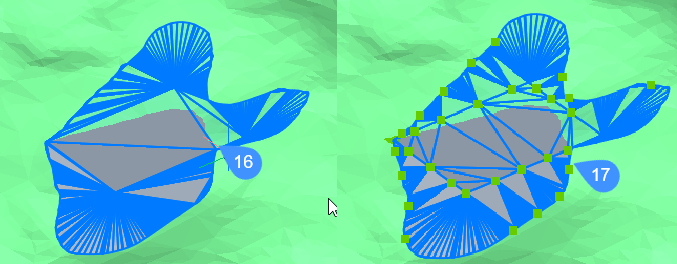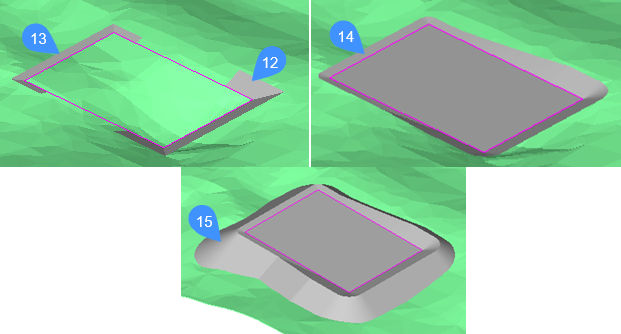 - 根据生成的放坡 (14),创建另一个坡度到TIN曲面的放坡,并关闭其填充参数。结果放坡为 (15)。