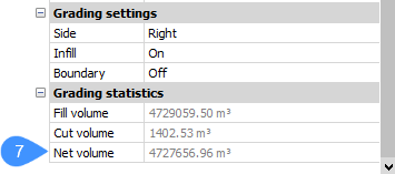 控制放坡的边界。当放坡边界处于打开状态时,该边界将作为隐藏边界添加到目标曲面。下图显示了池塘的调配边界何时关闭 (5) 和打开 (6)。根据调配边界,计算池塘主体的净体积,可以在属性面板 (7) 中找到。