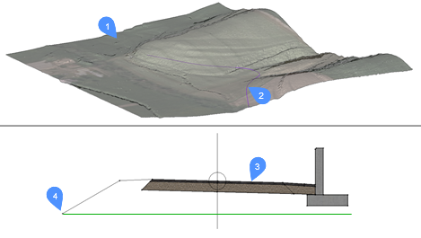 - 打开包含TIN曲面 (1)、三维对齐 (2)、廊道模板 (3) 和添加到模板元素点 (4) 的曲面目标的图形文件。