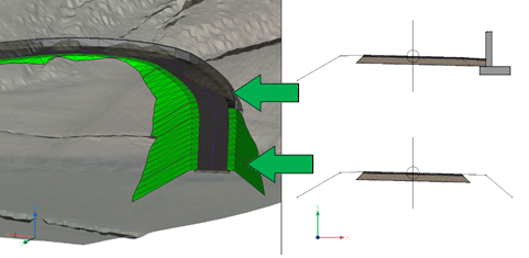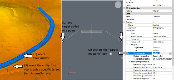 当单个廊道样板元素的几何图形必须遵循特定曲面、水平或垂直对象时,将创建一个目标并将其添加到廊道样板元素上的相应点。可以定义以下目标类型:曲面、水平和垂直目标。