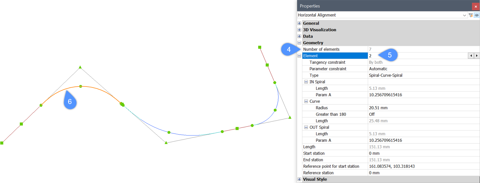 - 单击“元素”字段 (5) 后,当前选定的元素将在绘图中突出显示 (6)。