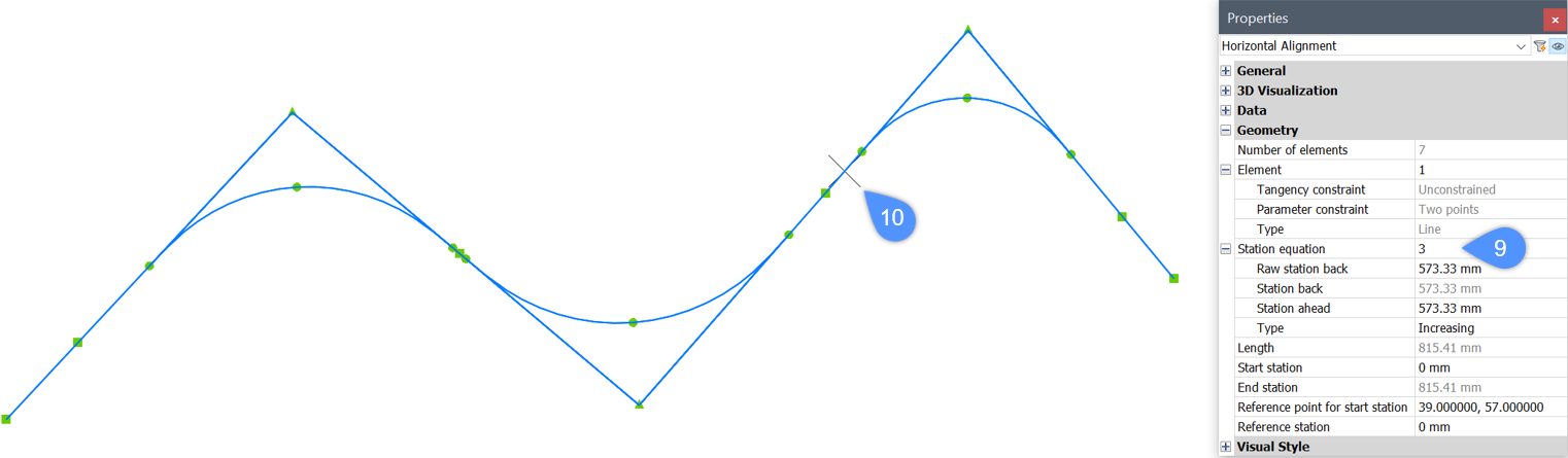 - 单击桩号方程字段 (9) 后,当前选定的桩号方程将在绘图 (10) 中突出显示。