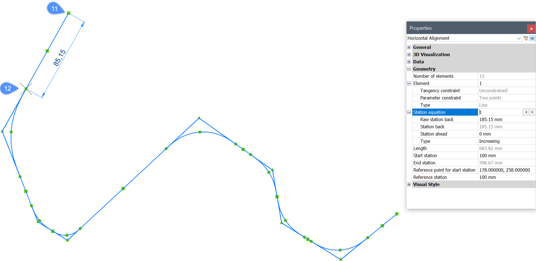 您可以在创建的桩号方程之间切换,并在属性面板中编辑参数。